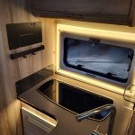 De camper heeft een ruime garage met voldoende opslagruimte. Daarnaast is er een extra rek in geplaatst om elektrische fietsen op te plaatsen.